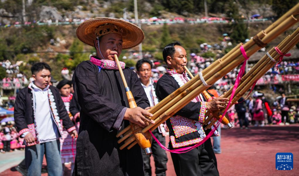 2月19日,苗族群众在六枝特区梭戛苗族彝族回族乡高兴村跳花场吹奏芦笙。新华社记者 陶亮 摄