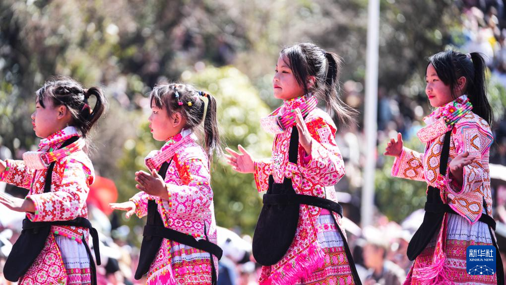 2月19日,小朋友在六枝特区梭戛苗族彝族回族乡高兴村跳花场表演舞蹈。新华社记者 陶亮 摄