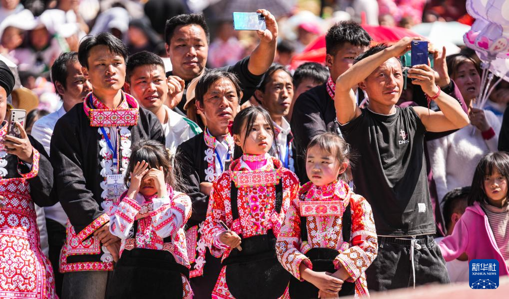 2月19日,当地群众在六枝特区梭戛苗族彝族回族乡高兴村跳花场旁观看表演。新华社记者 陶亮 摄