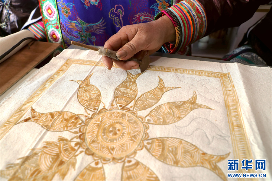 3月6日,在贵州省黔东南苗族侗族自治州榕江县三江乡冷衣村,苗族妇女在画蜡画。新华网发(李长华 摄)