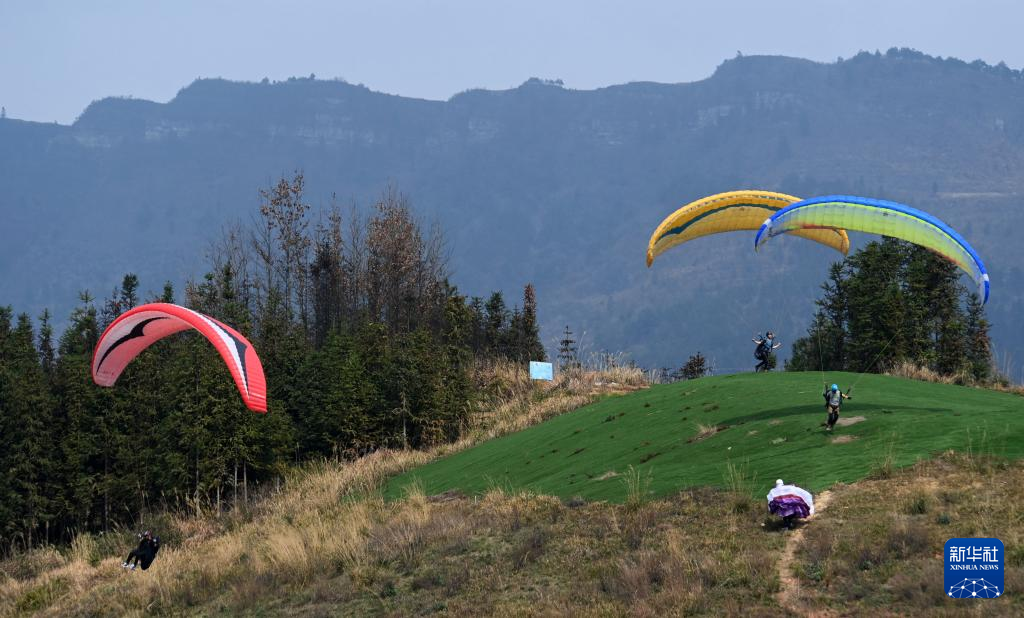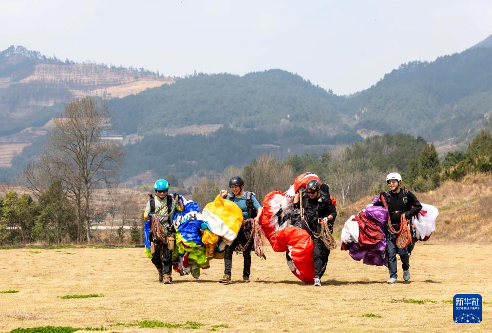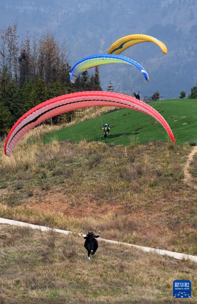 3月9日,爱好者在贵州省黔东南苗族侗族自治州黄平县旧州古镇参加滑翔伞飞行训练。新华社发(范晖 摄)