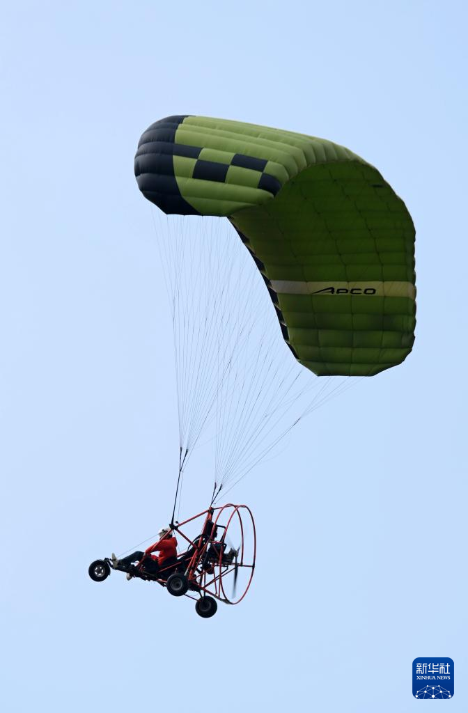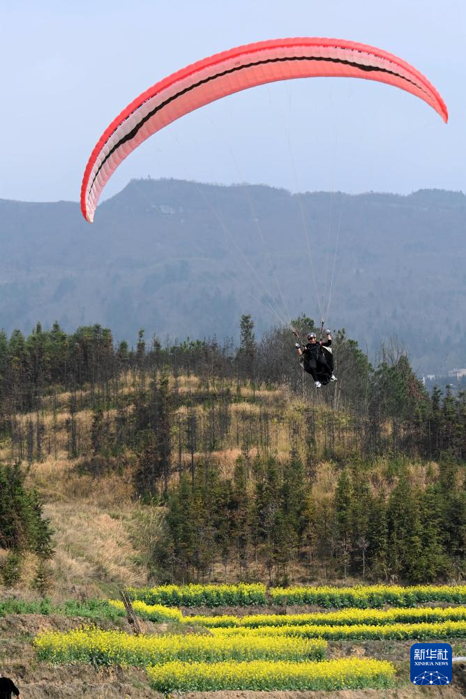 3月9日,爱好者在贵州省黔东南苗族侗族自治州黄平县旧州古镇体验滑翔伞飞行。新华社发(范晖 摄)