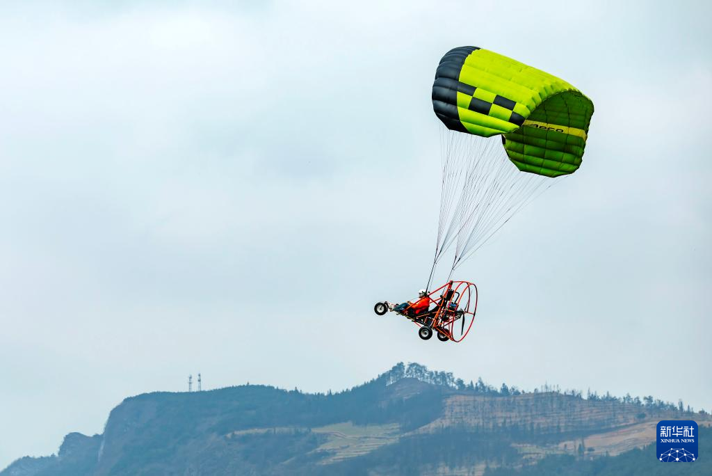 3月9日,爱好者在贵州省黔东南苗族侗族自治州黄平县旧州古镇参加滑翔伞飞行训练。