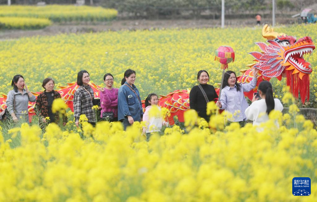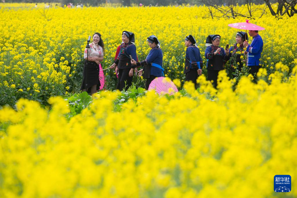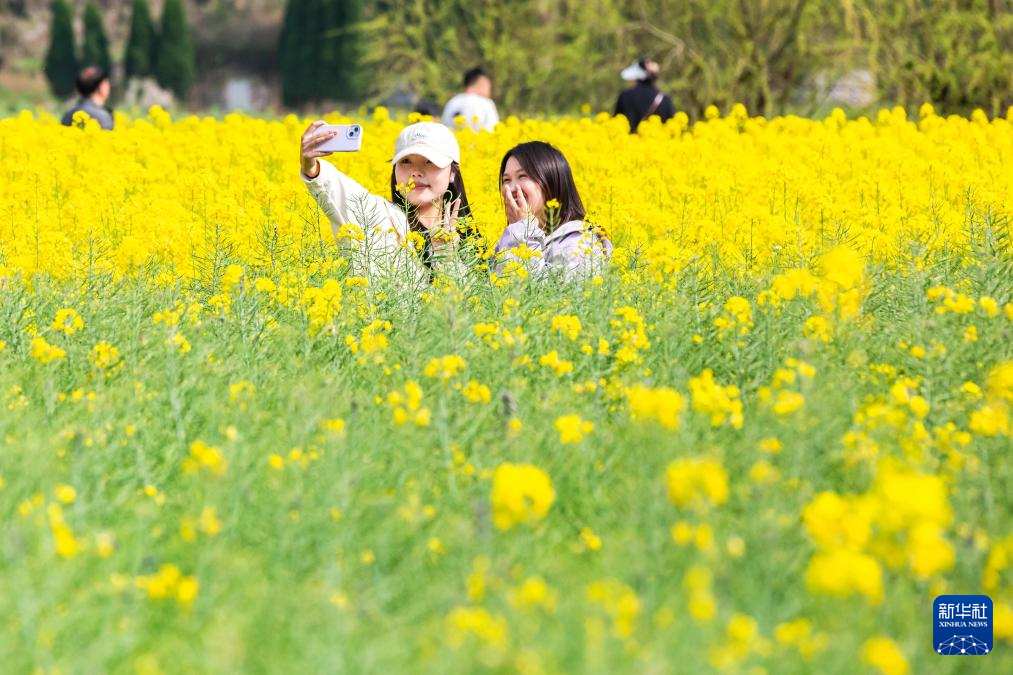 3月16日,游客在贵州省安顺市西秀区大西桥镇鲍家屯村油菜花田间拍照。新华社发(陈熙摄)