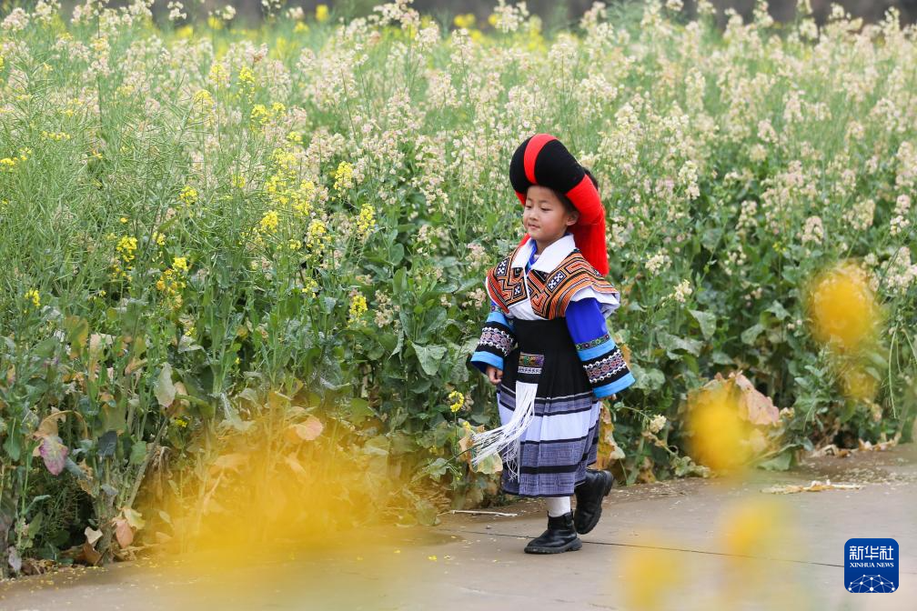 3月16日,在贵州省都匀市小围寨街道马尾村,一名小朋友在油菜花田里游玩。新华社发(肖伟摄)