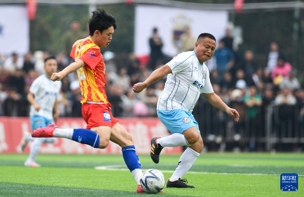 3月16日,党相村足球队球员(右)与扒王村足球队球员在比赛中。新华社记者 杨文斌 摄