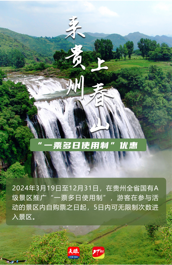 会上,为让全国游客分享贵州旅游发展红利,充分展示贵州特色文旅资源。2024年3月19日至12月31日,贵州推出2024年贵州文旅“四免一多一减”优惠活动,其中“一多”即为:“一票多日使用制”优惠,游客在参与活动的景区内自购票之日起,5日内可无限制次数进入景区。