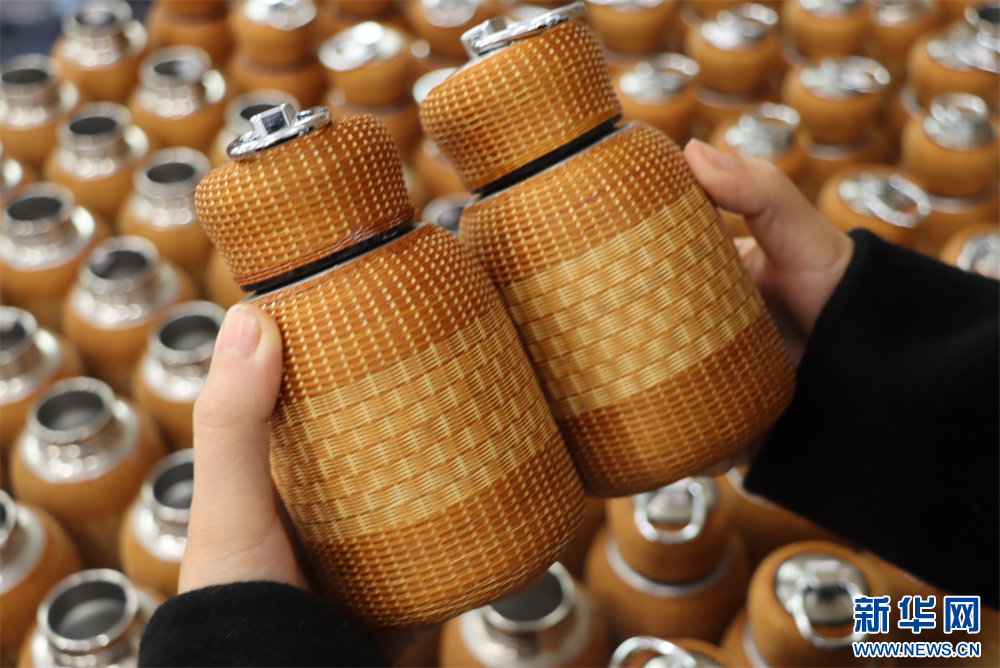 3月20日,在贵州省赤水市大同镇极竹堂非遗竹编产学研基地,工人展示编制的立体竹编产品。新华网发(张浪摄)