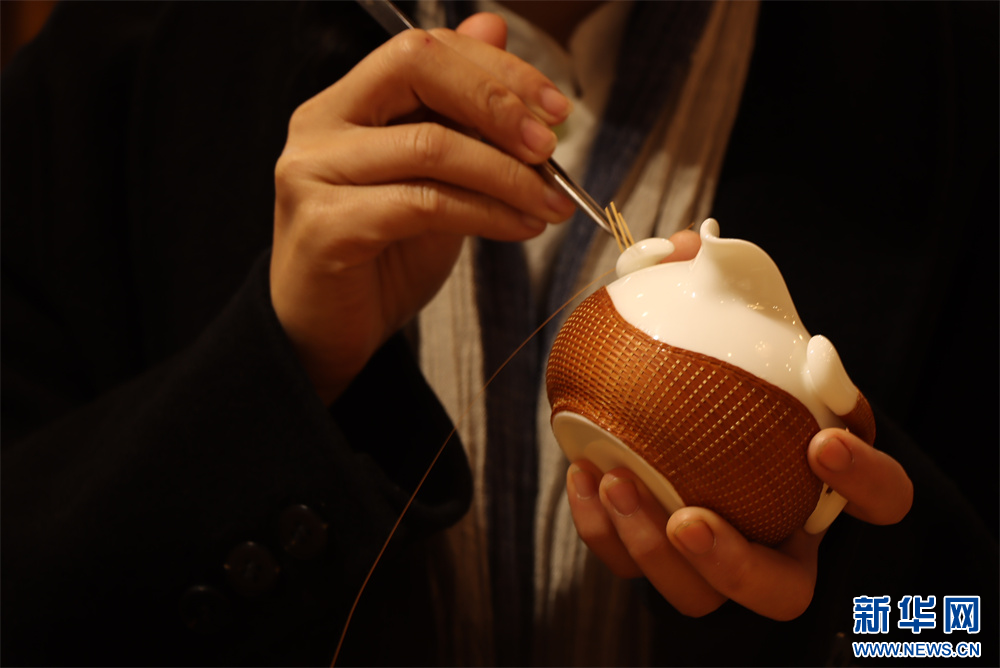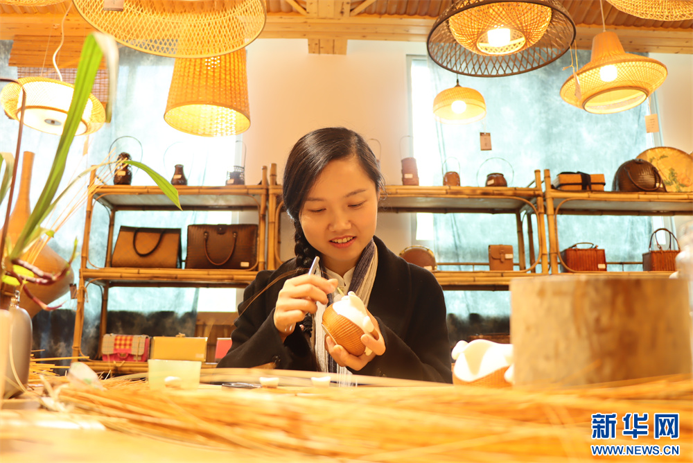 3月20日,在贵州省赤水市大同镇极竹堂非遗竹编产学研基地,工人在编制立体竹编。新华网发(张浪摄)