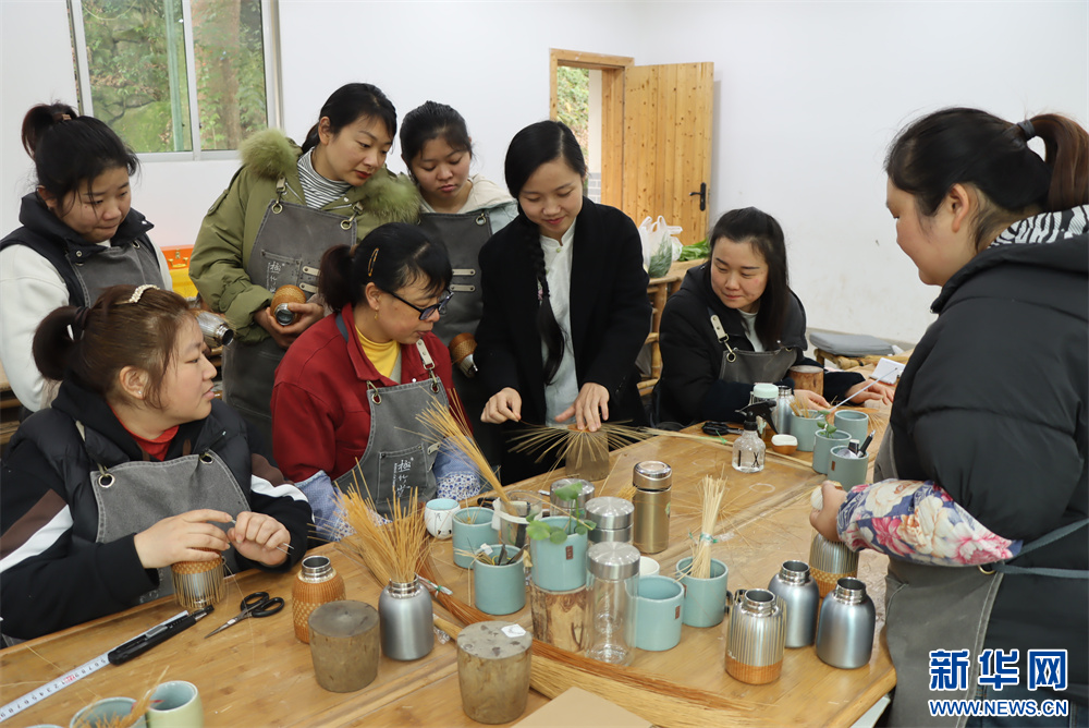 3月20日,在贵州省赤水市大同镇极竹堂非遗竹编产学研基地,杨昌芹(右三)指导工人编制立体竹编。新华网发(张浪摄)