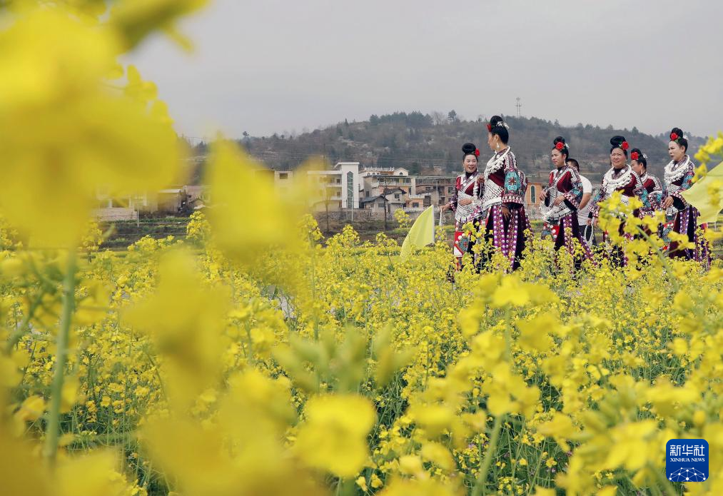 3月22日,人们在贵州省黔东南苗族侗族自治州施秉县城关镇上翁哨村油菜花田赏花游玩。