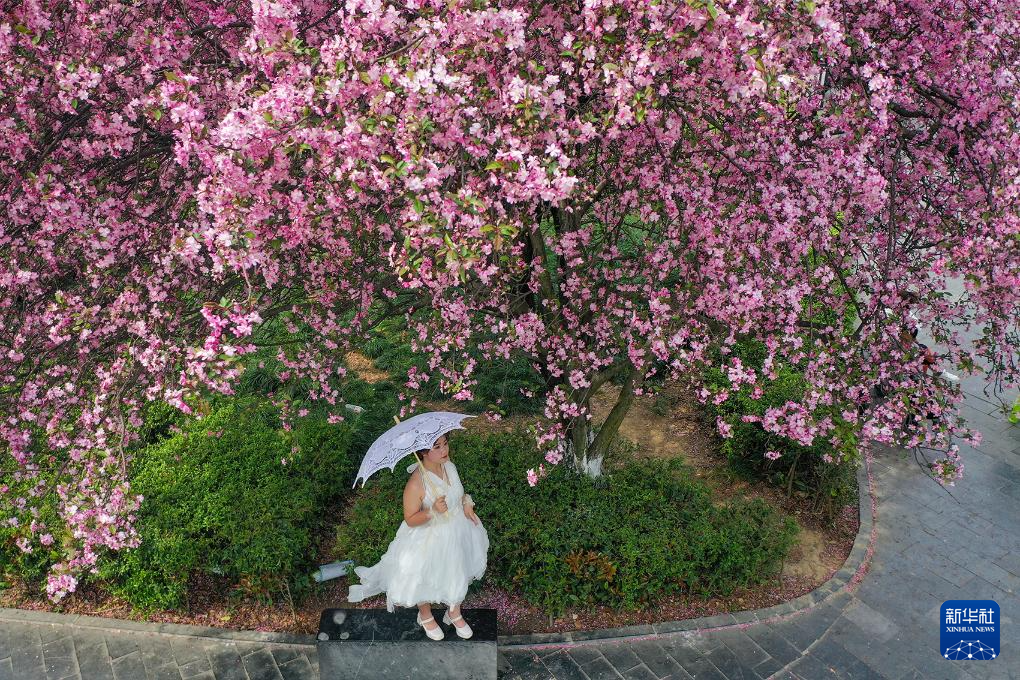 3月22日,市民在贵州省毕节市七星关区人民公园赏花拍照(无人机照片)。新华社发(李华摄)