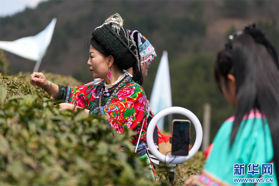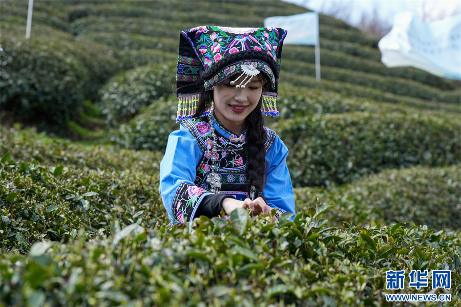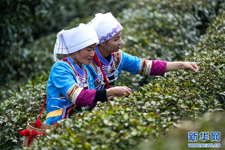 3月24日,茶农在贵州省都匀市毛尖镇坪阳村茶园采摘春茶。新华网发(龙建睿 摄)