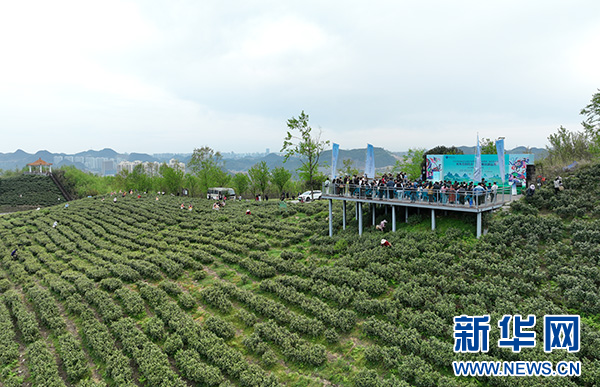 3月29日,春茶开采季活动在观山湖区朱昌镇神鹊茶场举行(无人机照片)。新华网发 (陈靖 摄)