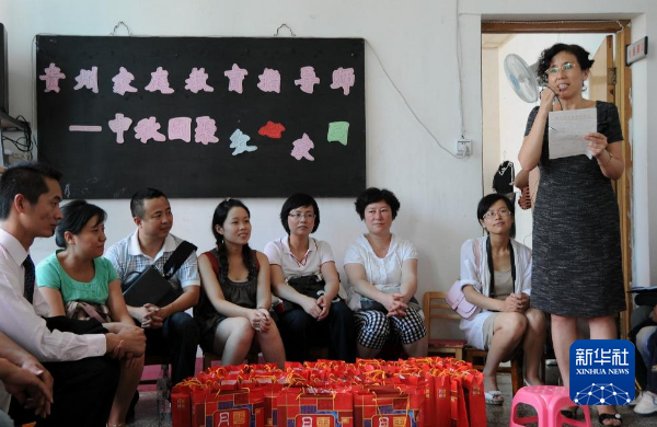 2010年中秋节前夕,爱心人士来到贵阳南明区爱心家园儿童特殊教育康复训练中心,给孤独症孩子送月饼。右一站立者为赵新玲。新华社记者 李惊亚 摄