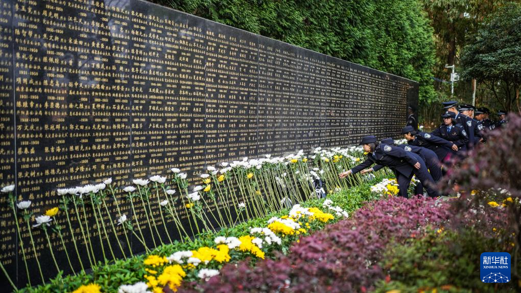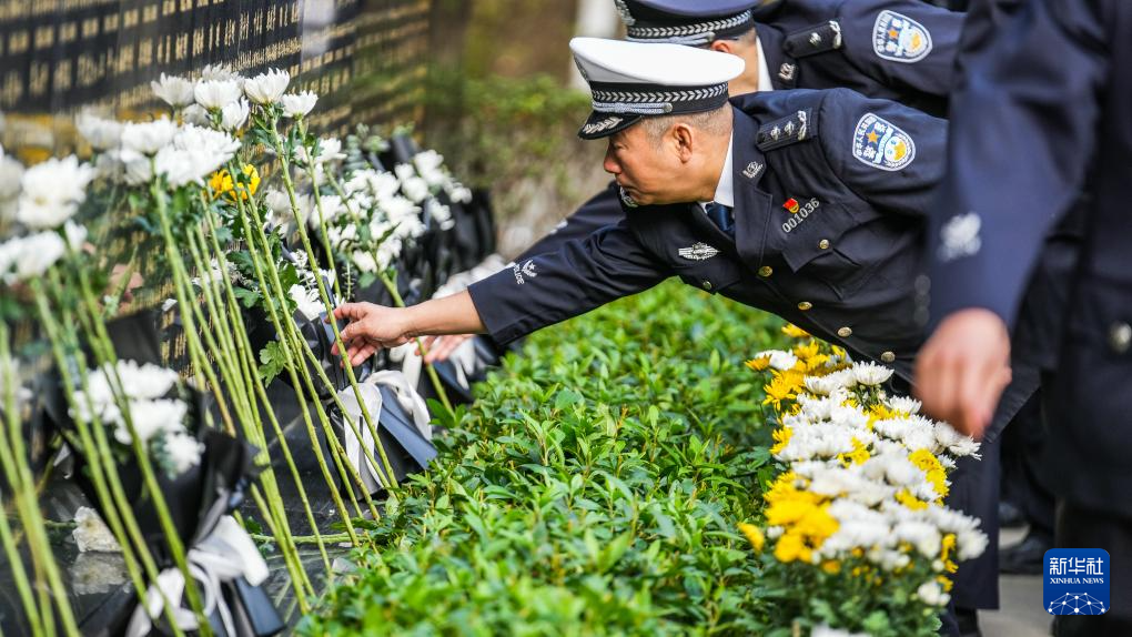 4月3日,在贵州公安英烈纪念墙前,民警代表向公安英烈敬献鲜花。新华社记者 陶亮 摄