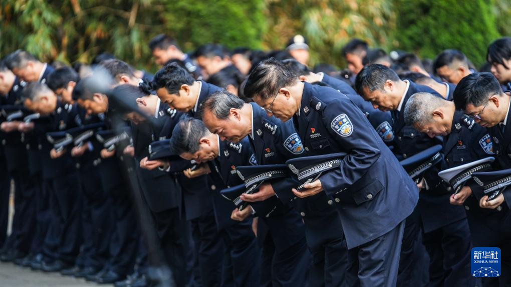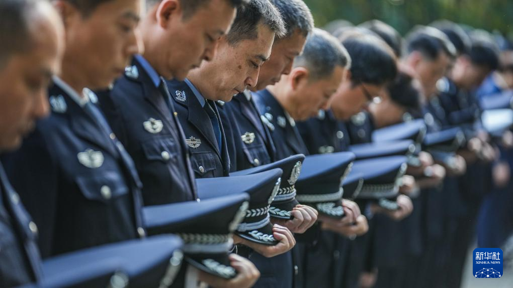 4月3日,在贵州公安英烈纪念墙前,民警代表向公安英烈脱帽致哀。新华社记者 陶亮 摄