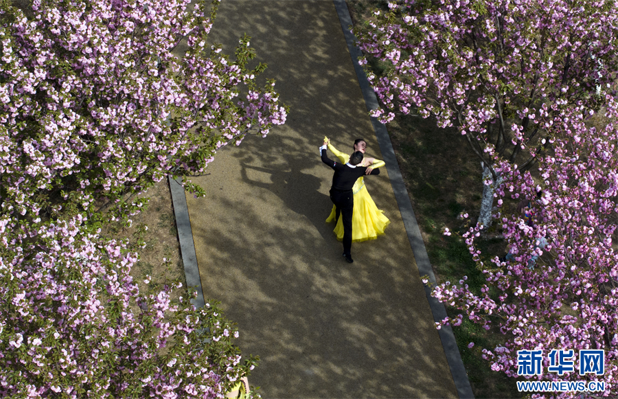 4月2日,市民在贵州省六盘水市水城河畔的樱花树下练习交谊舞。新华网发(尚宇杰 摄)