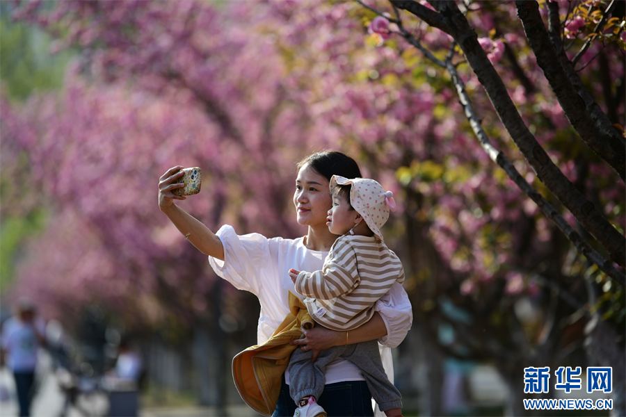4月2日,市民在贵州省六盘水市水城河畔拍照留念。新华网发(尚宇杰 摄)