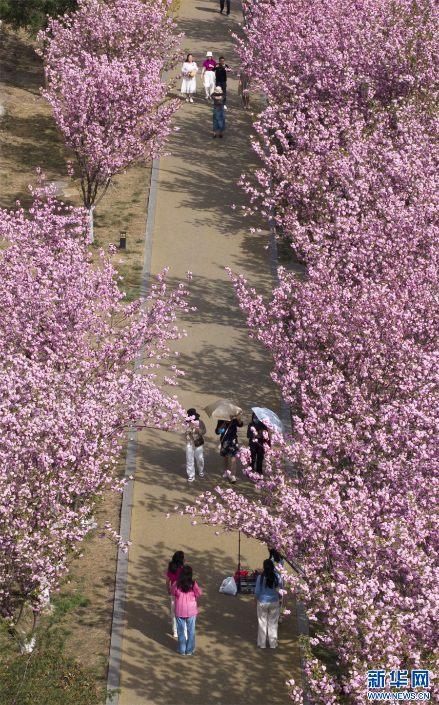 4月2日,市民在贵州省六盘水市水城河畔赏樱游玩。新华网发(尚宇杰 摄)