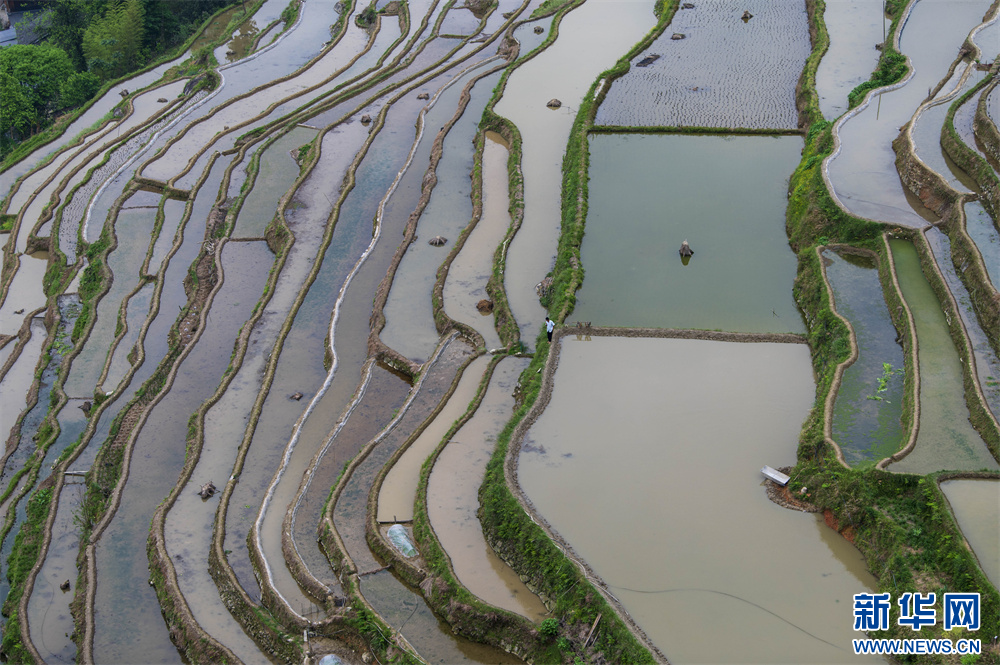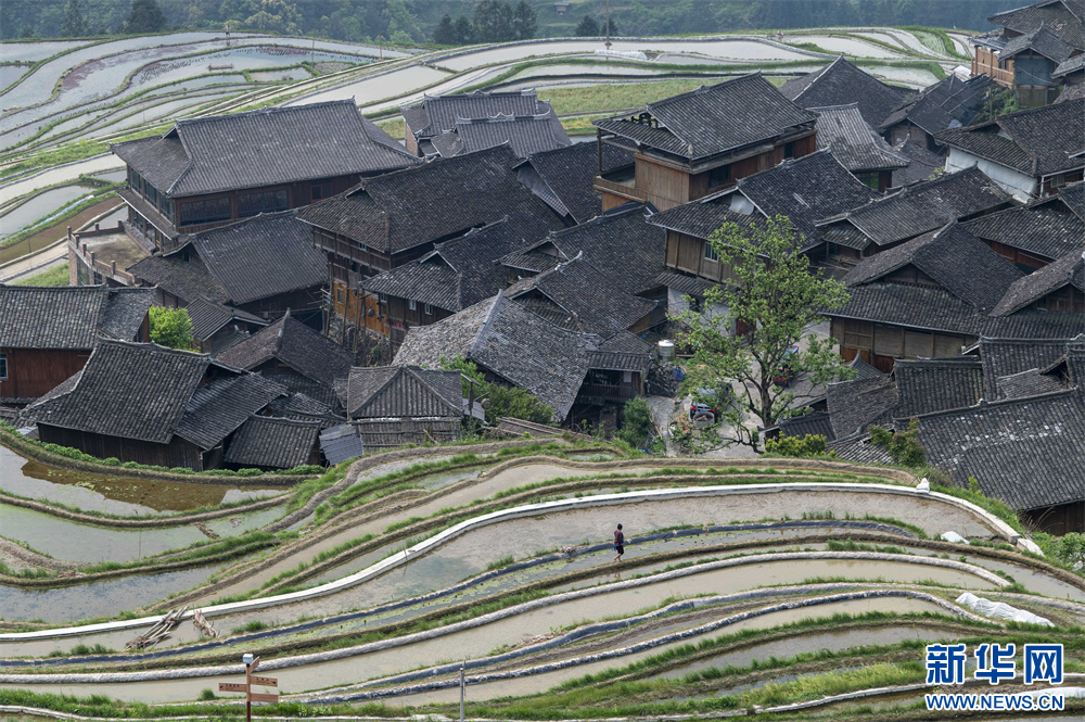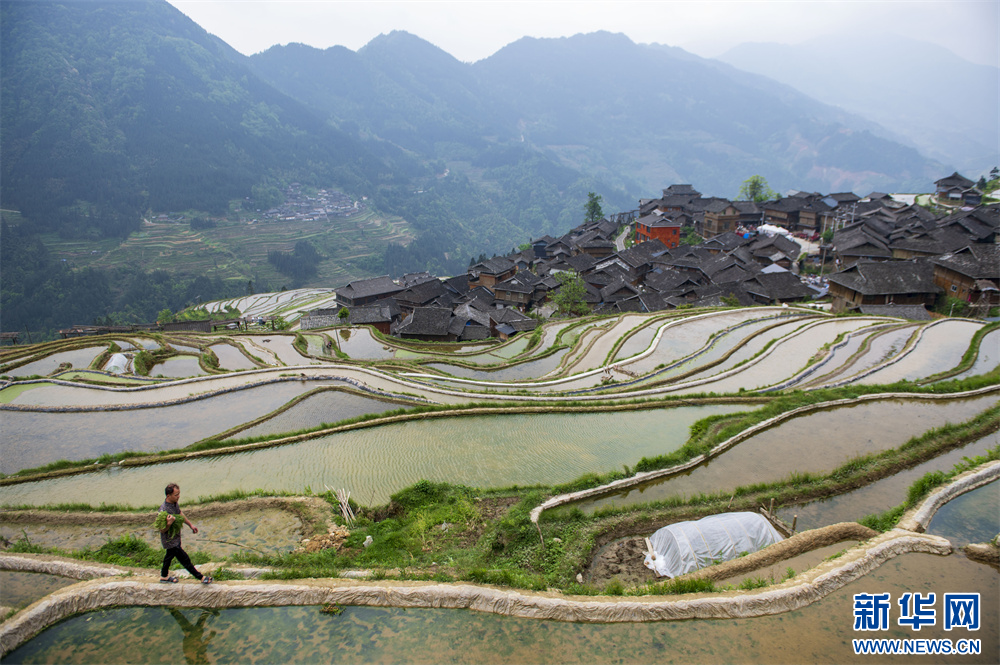 4月16日,农民走在贵州省从江县加榜梯田上。新华网发(吴德军摄)