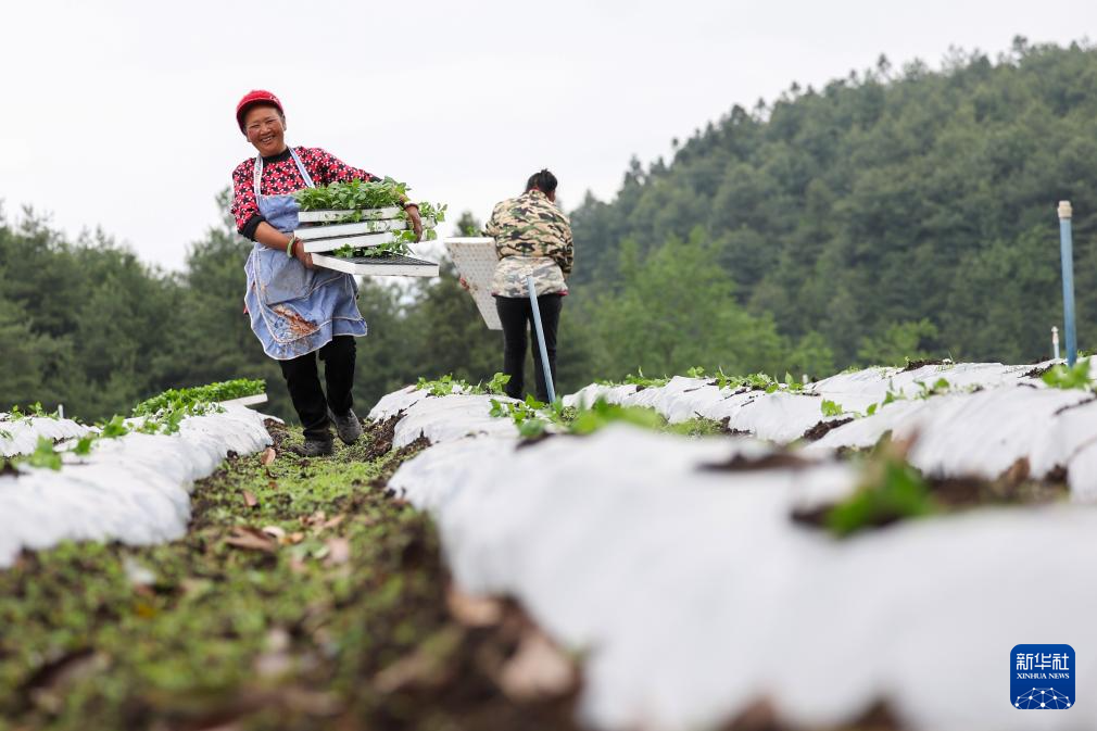 4月20日,贵州省毕节市赫章县平山镇中山社区农户在田里搬运辣椒苗。新华社发(韩贤普摄)