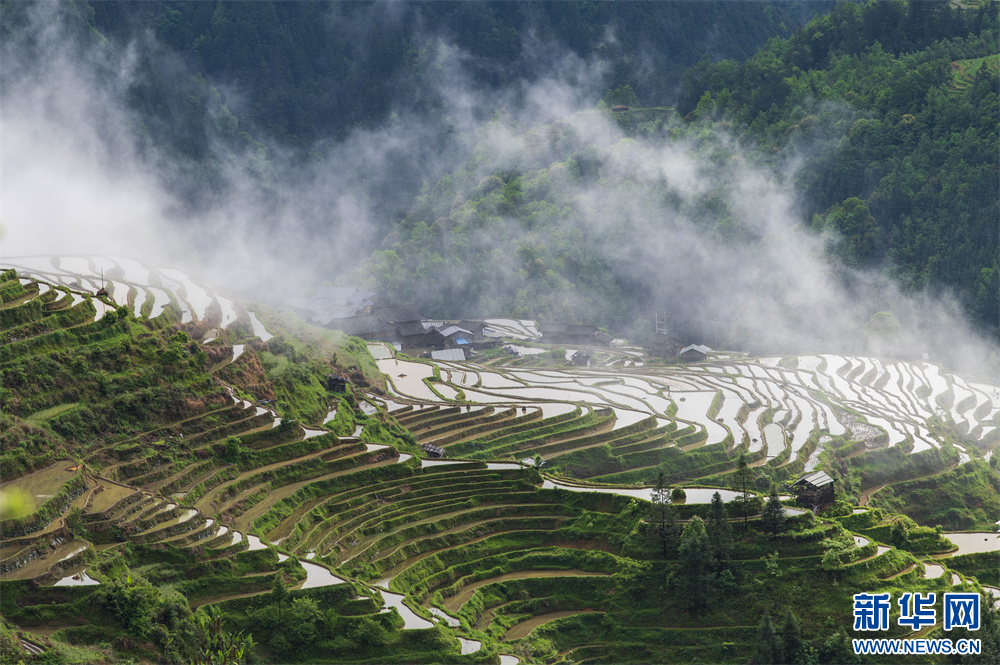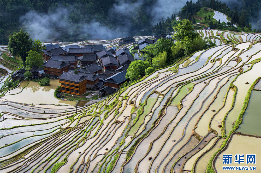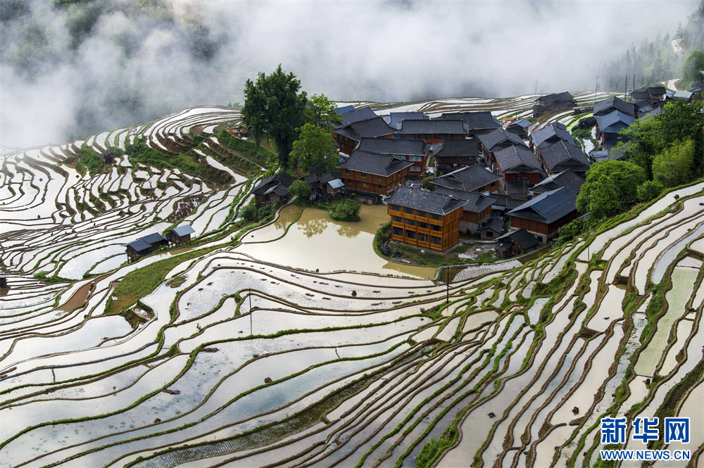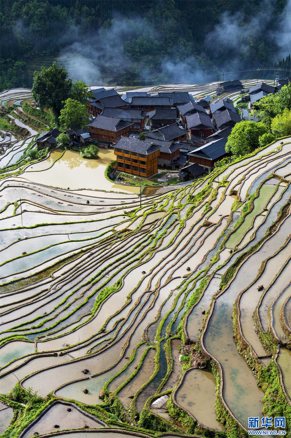 当日,雨后的贵州省黔东南苗族侗族自治州从江县加榜梯田景区,云雾缭绕,空气清新,翻耕蓄足水后的梯田线条分明、平整如镜,与农房、山林、河流等交相辉映,构成一幅美丽的春日田园画卷。
