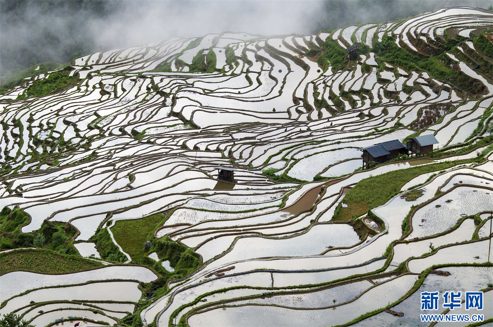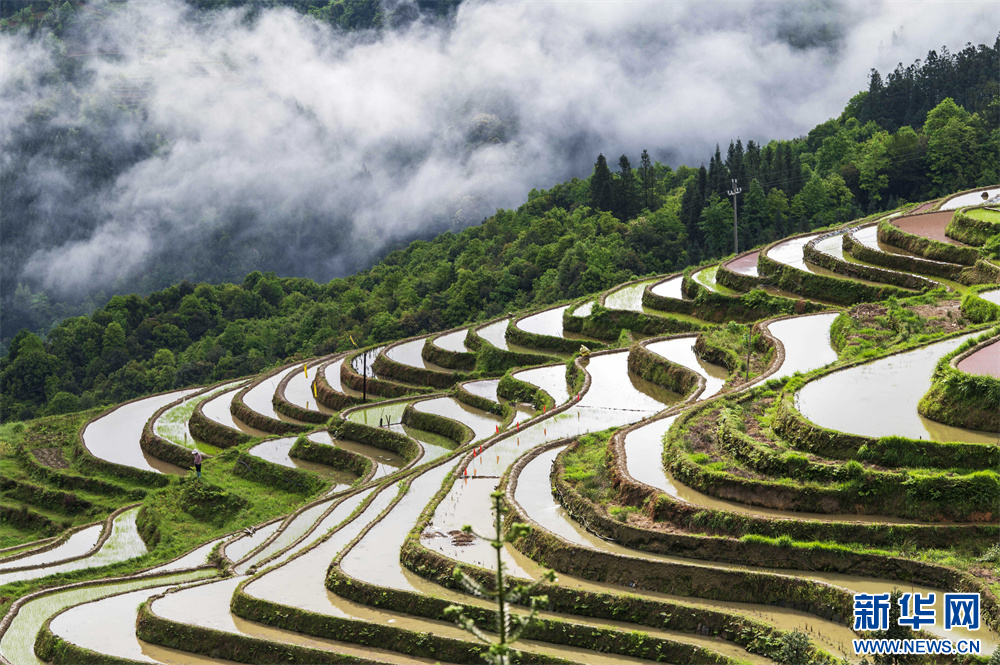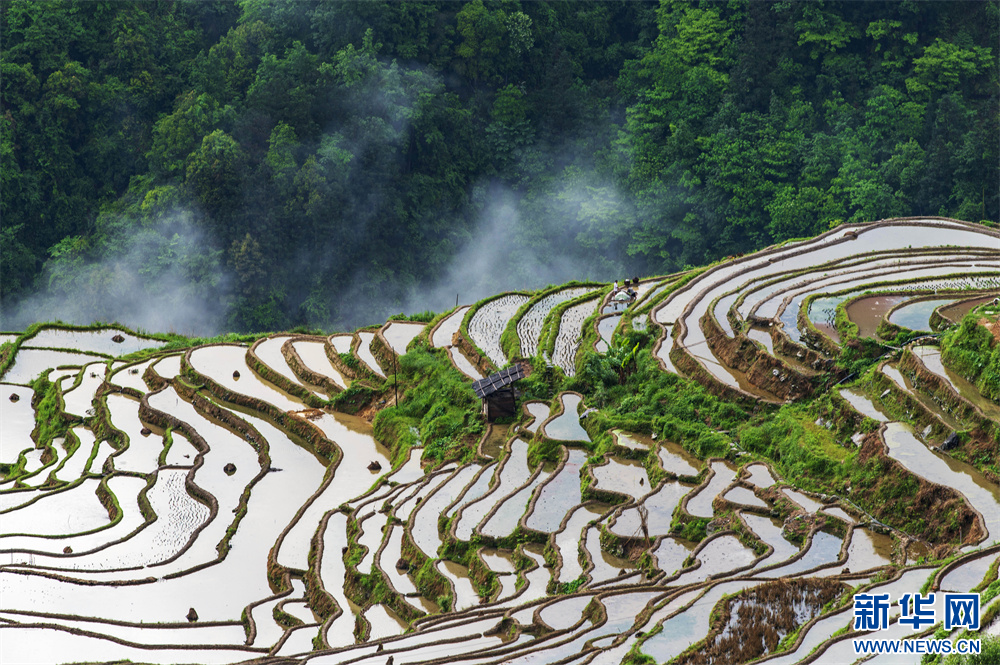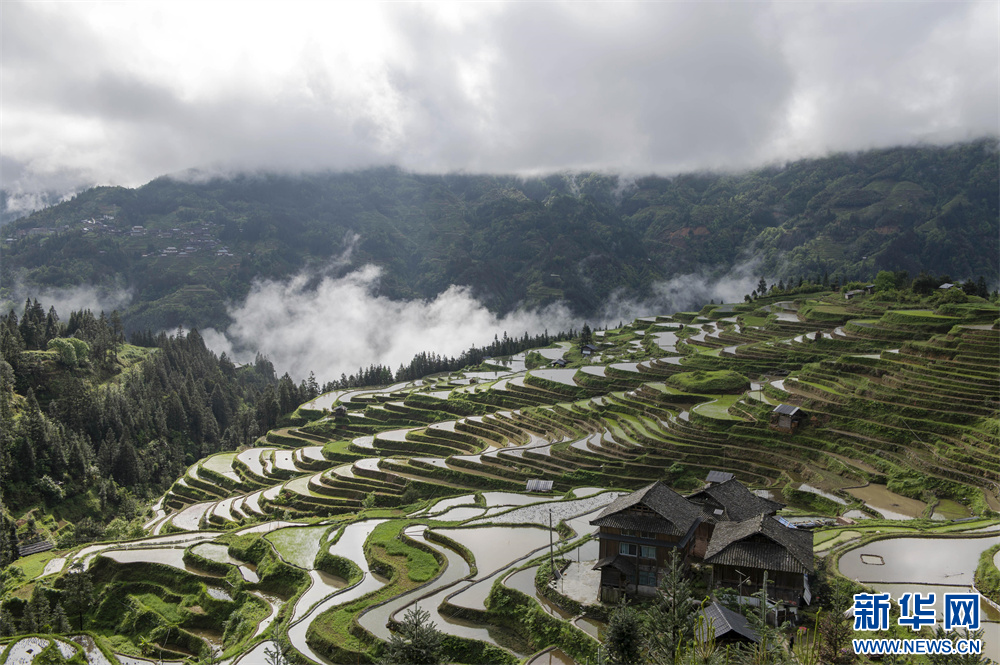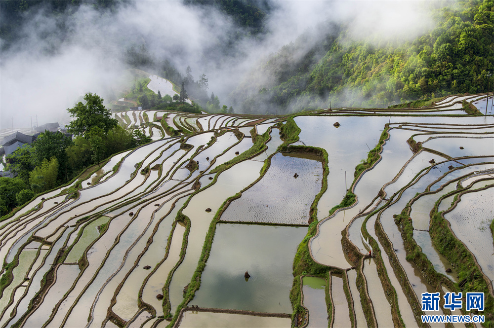 当日,雨后的贵州省黔东南苗族侗族自治州从江县加榜梯田景区,云雾缭绕,空气清新,翻耕蓄足水后的梯田线条分明、平整如镜,与农房、山林、河流等交相辉映,构成一幅美丽的春日田园画卷。