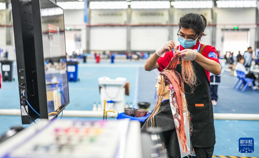 这是5月8日拍摄的第二届全国乡村振兴职业技能大赛美发项目比赛现场。新华社记者 陶亮 摄