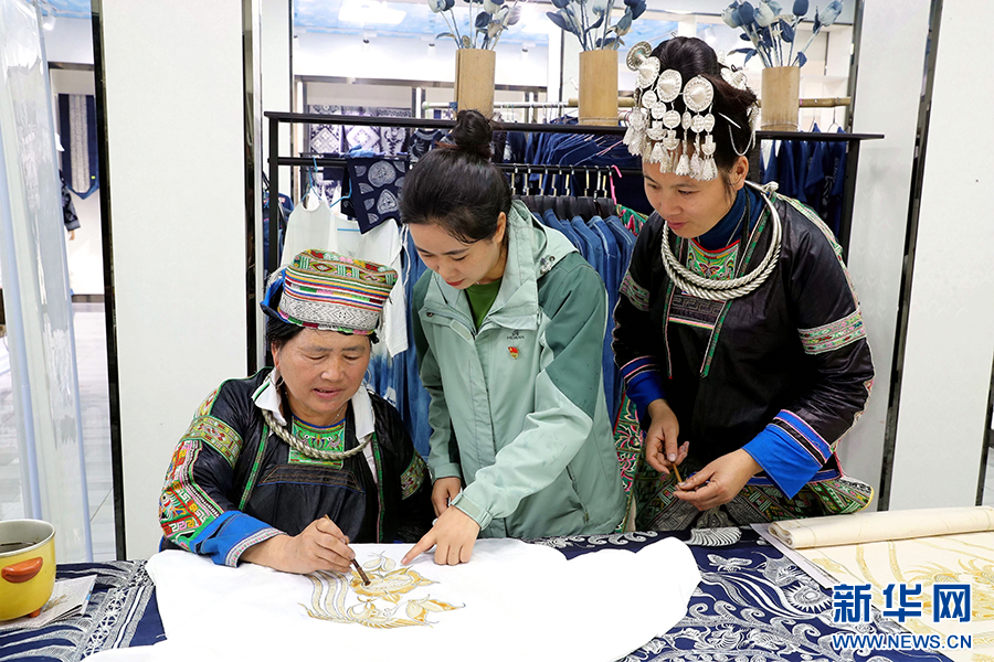 5月8日,在贵州省黔东南苗族侗族自治州榕江县兴华水族乡摆贝苗寨,驻村第一书记罗丽萍(中)与苗族妇女一起制作蜡染产品。新华网发(李长华 摄)