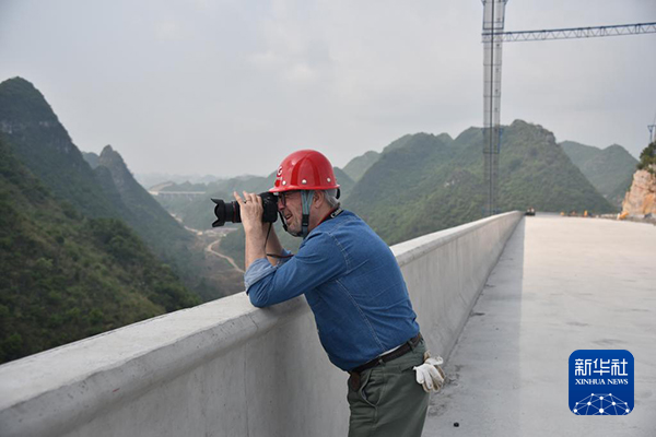法国摄影师格雷瓜尔·戴高乐在花江峡谷大桥施工现场拍摄(4月27日摄)。新华社记者 骆飞 摄