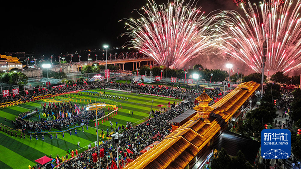 在贵州省榕江县举行的2024全国“村晚”示范展示活动暨贵州“村超村晚”活动中,音乐烟花秀精彩上演(2024年2月3日摄,无人机照片)。新华社记者 刘续 摄