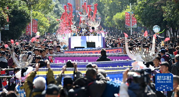 在贵州雷山县县城,苗族群众身着盛装,载歌载舞参加苗年和鼓藏节的巡游活动(2023年11月16日摄)。新华社记者 杨楹 摄