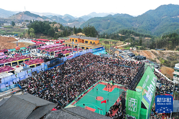 贵州省台江县举办的2024年“村BA”球王争霸赛现场(2024年3月22日摄,无人机照片)。新华社记者 杨文斌 摄