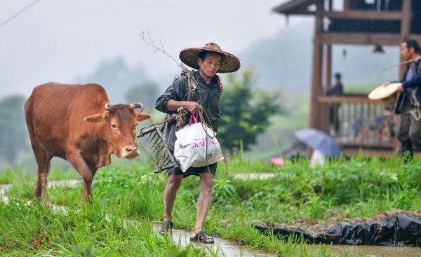 5月18日,在贵州省黎平县尚重镇洋洞村,村民牵着耕牛前来参加牛耕活动。