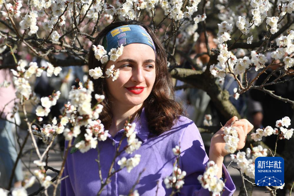 3月30日,一名外国游客在山东省青岛市中山公园梅园拍照打卡。新华社发(王海滨 摄)