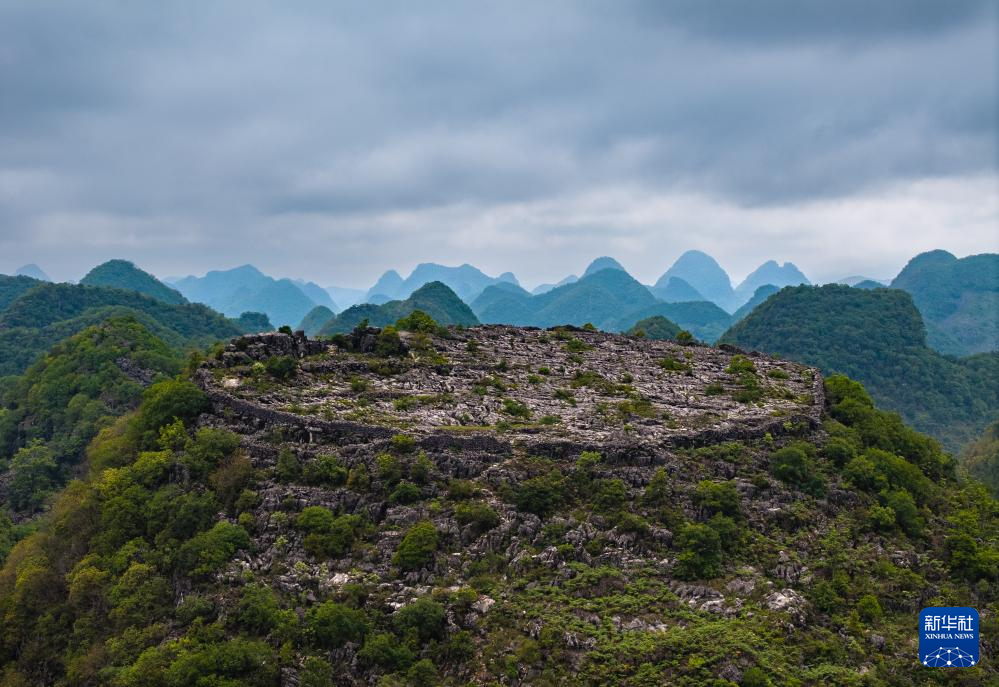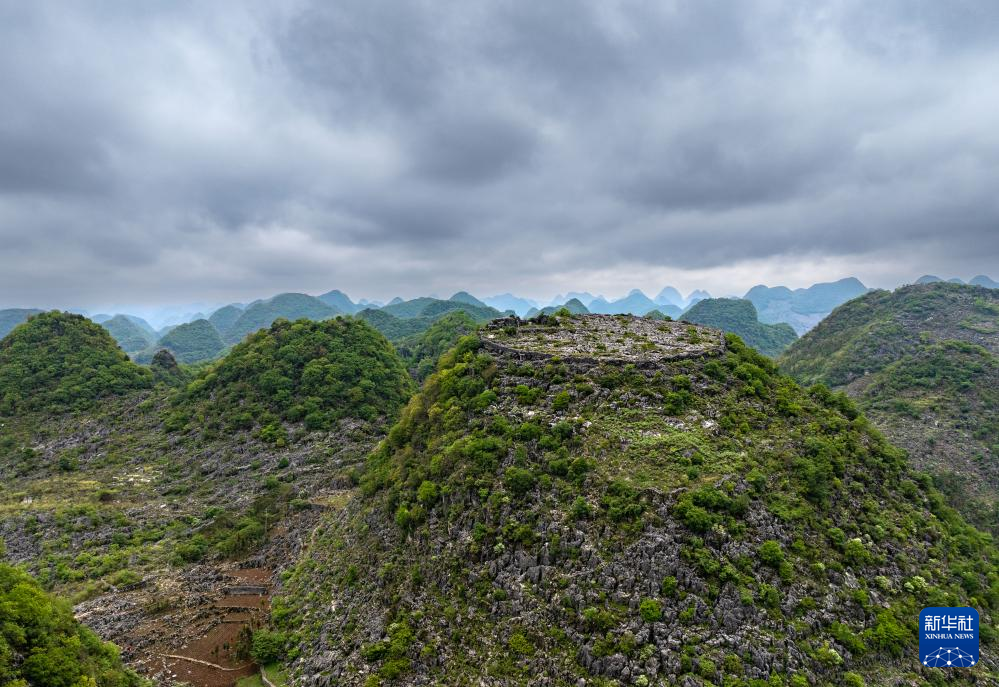 这是位于卢家营附近“消失”的山峰,山顶还留有防御营墙(无人机照片,5月16日摄)。新华社记者 刘续 摄