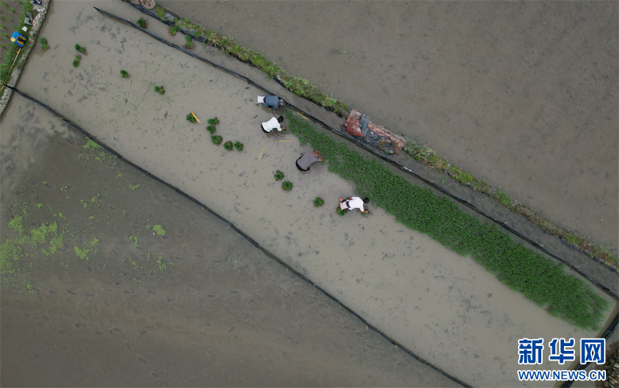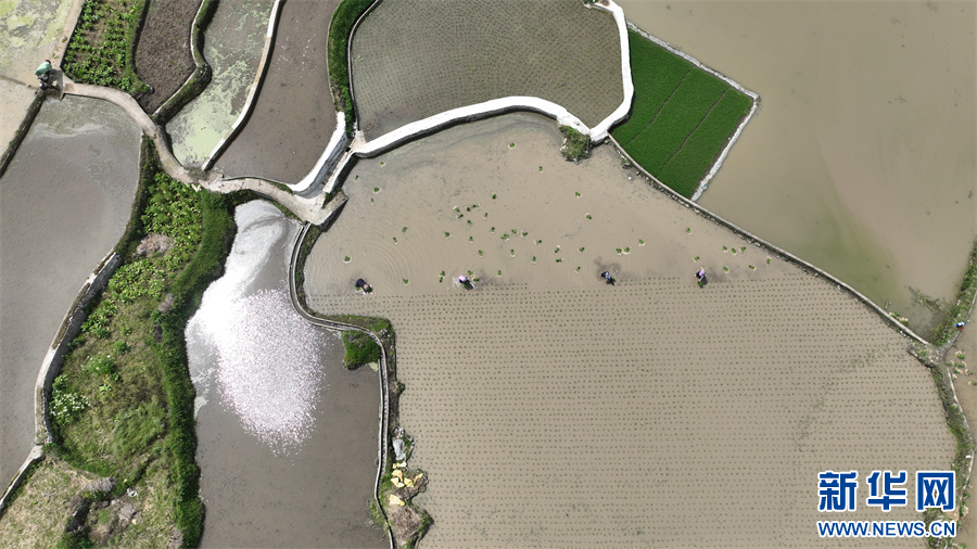 5月20日,村民在贵州省黔东南苗族侗族自治州丹寨县扬武镇长青社区田间插秧(无人机照片)。新华网发(邹燕摄)