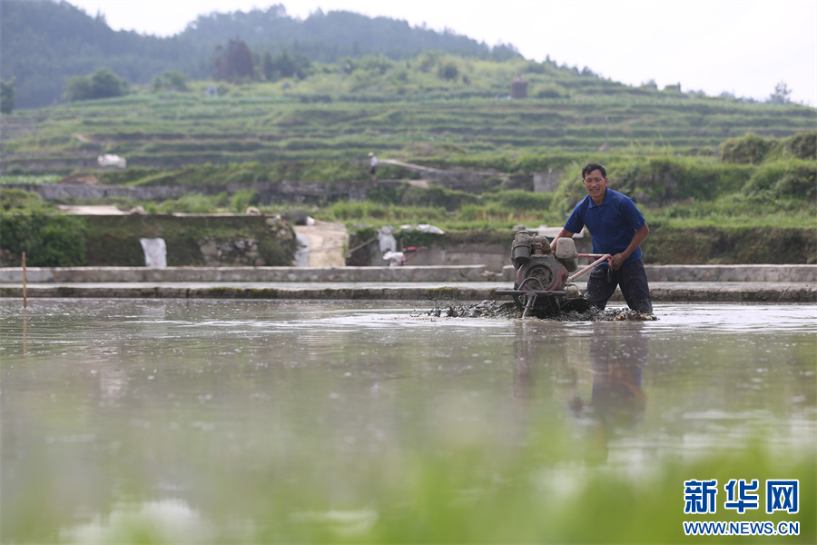 5月20日,村民在贵州省黔东南苗族侗族自治州丹寨县扬武镇长青社区驾驶农机犁田。新华网发(邹燕摄)