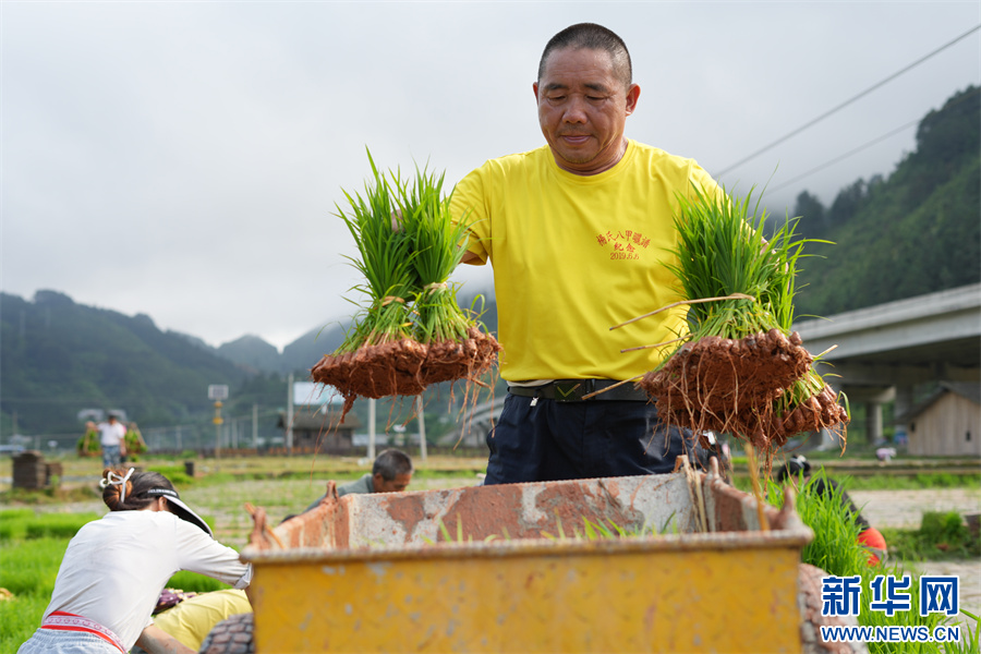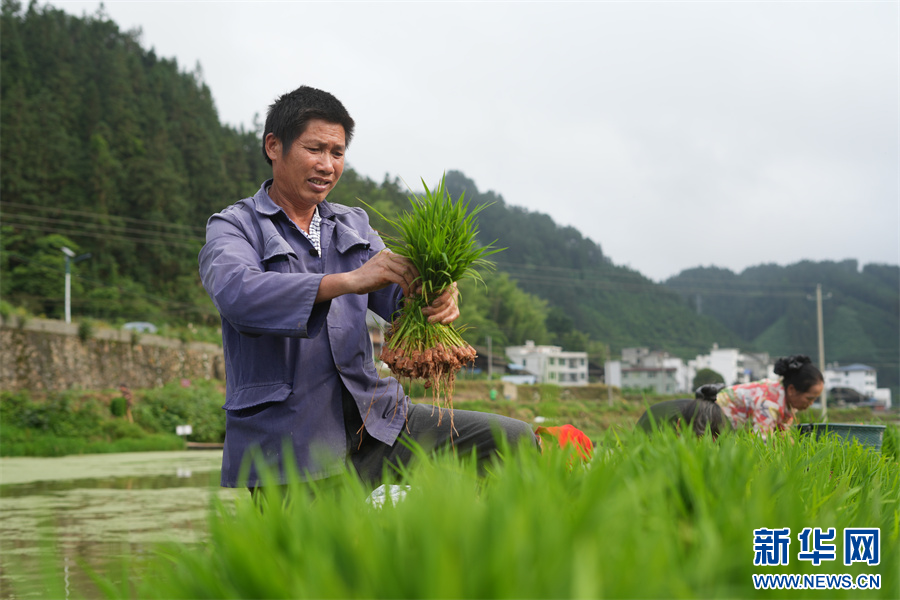 5月20日,在贵州省黔东南苗族侗族自治州榕江县朗洞镇平地村,村民在扯秧、运苗。新华网发(吴化雨 摄)