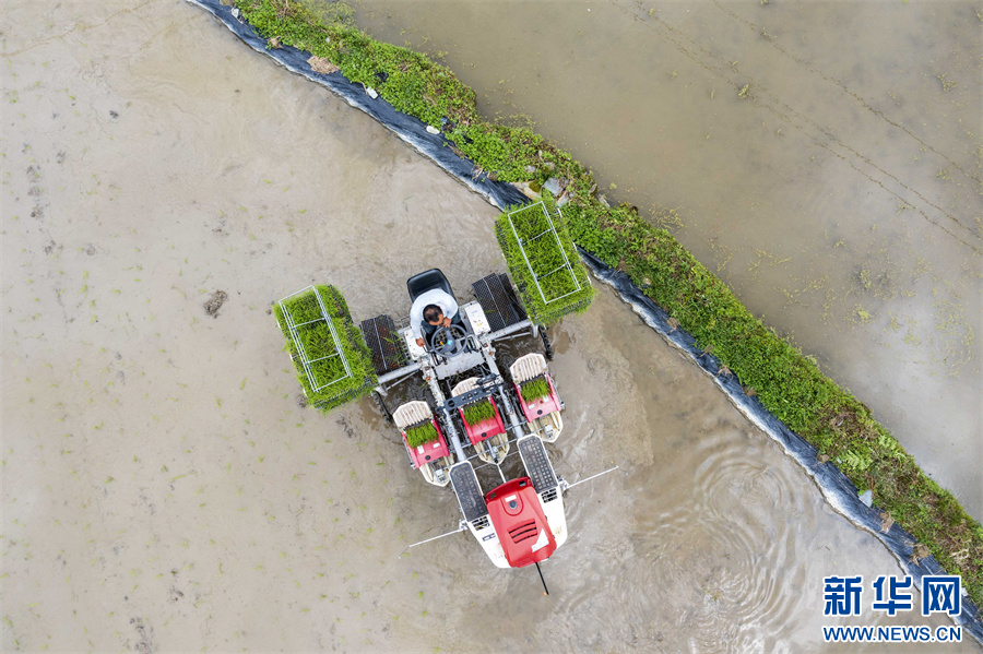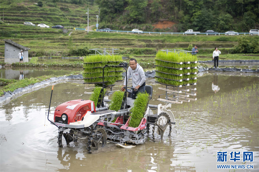5月20日,在贵州省黔东南苗族侗族自治州从江县往洞镇信地村,农民驾驶插秧机插秧苗。新华网发(吴德军 摄)