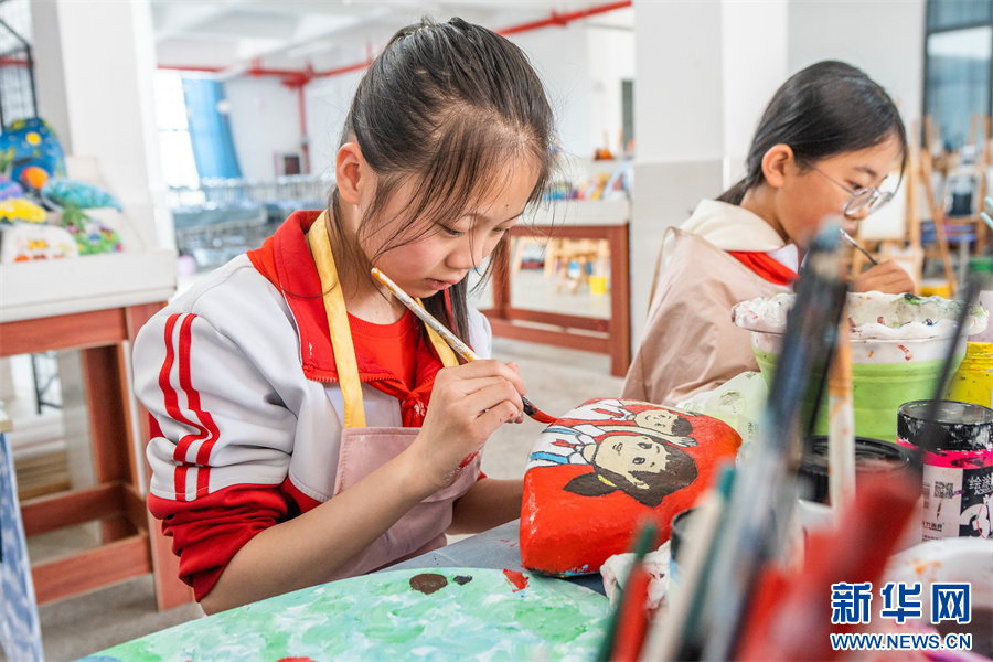 当日,贵州省毕节市威宁彝族回族苗族自治县第五小学的不少学生课后来到美术社团教室,拿出画笔、颜料,在石头上画出人物、熊猫、兔子、自然风光等图案,一块块普通的石头通过孩子们的精巧设计和描绘,被赋予新的“生命”。除在石头上绘画外,学生们还将自己的创意挥洒在簸箕、纸伞、扇子上,将它们变成一幅幅独特多彩的美术作品。