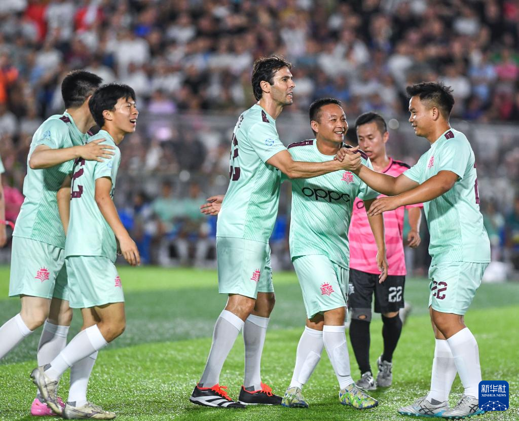 5月27日,卡卡(左)在“逐梦”冠军明星公益赛中和队友庆祝进球。新华社记者 刘续 摄