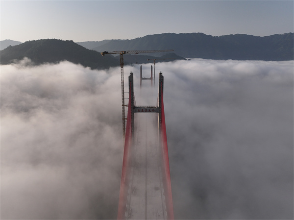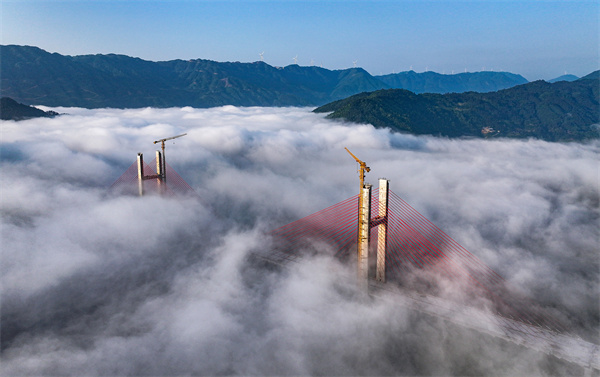 据悉,南孟溪特大桥位于贵州省剑河县南加镇境内,是剑黎高速公路控制性工程之一,为双塔双索面预应力砼斜拉桥,桥梁全长987.5米,双塔塔高分别为244.5、253.5米。