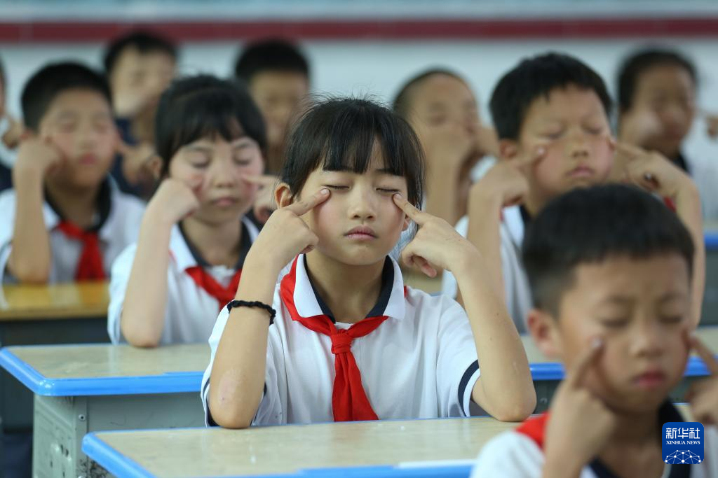 6月6日,贵州省黔南布依族苗族自治州福泉市实验学校的学生在做眼保健操。新华社发(肖伟 摄)