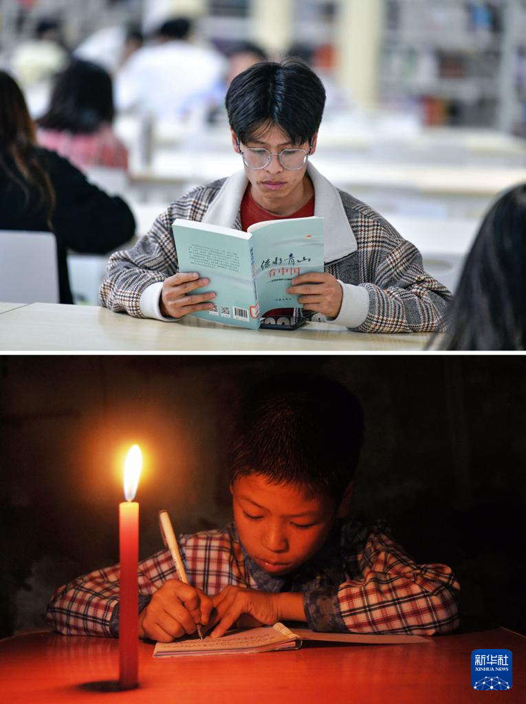 拼版照片:上图为2024年6月4日,邓广伟在贵州黔南科技学院的图书馆阅读课外书;下图为2014年7月27日,邓广伟在贵州威宁县农村老家点着蜡烛做作业。新华社记者 杨文斌 摄