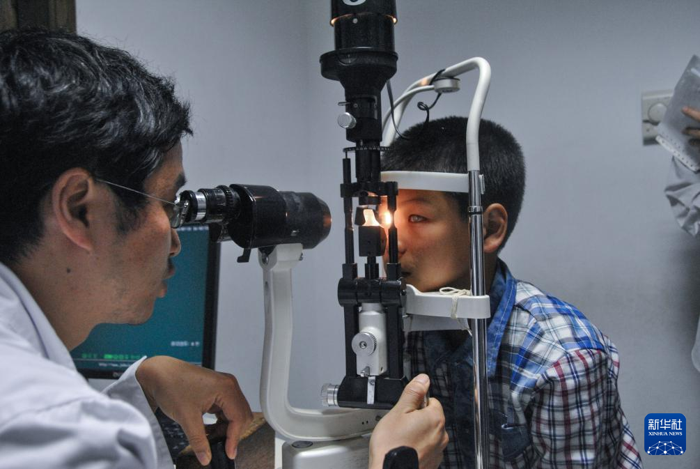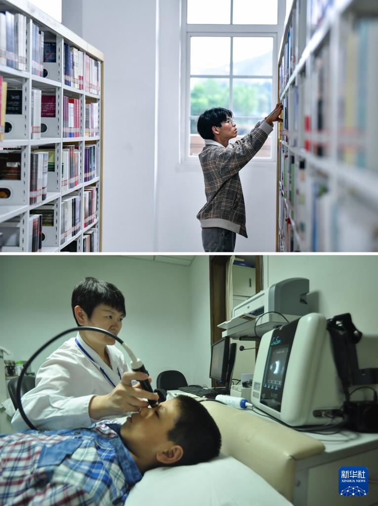 拼版照片:上图为2024年6月4日,邓广伟在贵州黔南科技学院的图书馆里翻阅图书;下图为2014年7月31日,邓广伟在上海复旦大学附属眼耳鼻喉科医院接受术前检查。新华社记者 杨文斌 摄