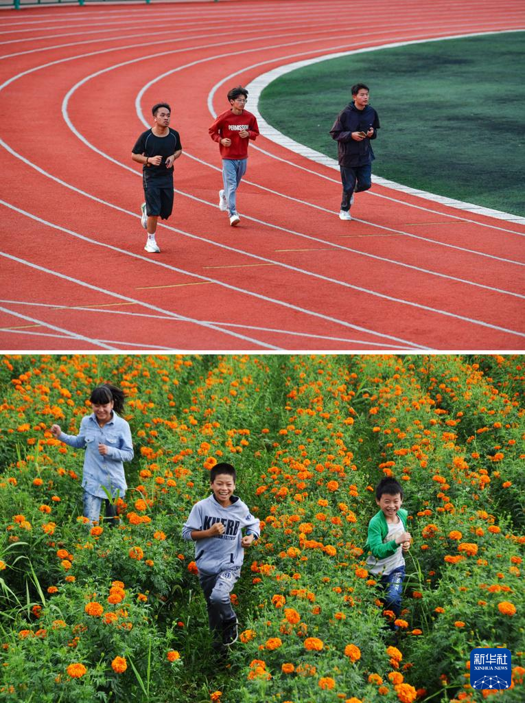 拼版照片:上图为2024年6月4日,邓广伟(中)与同学在贵州黔南科技学院的操场上跑步;下图为2015年8月19日,成功换上义眼的邓广伟(中)与同学在贵州威宁县老家的花田里玩耍。新华社记者 杨文斌 摄