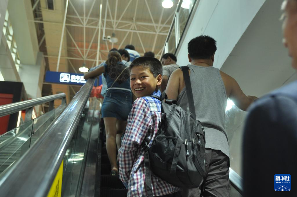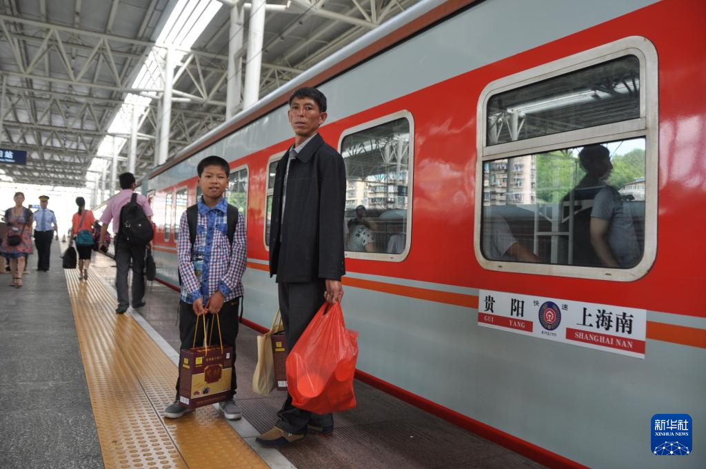 邓广伟与父亲来到贵阳火车站,准备搭乘前往上海的火车检查眼睛(2014年7月28日摄)。新华社记者 杨文斌 摄