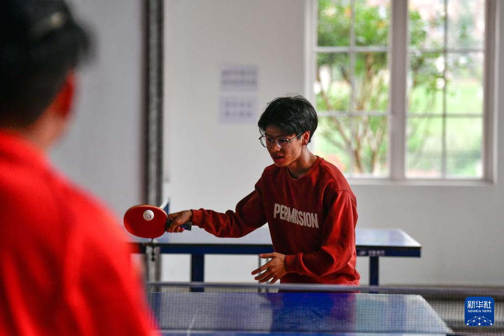 6月4日,邓广伟与同学在贵州黔南科技学院的体育馆打乒乓球。新华社记者 杨文斌 摄